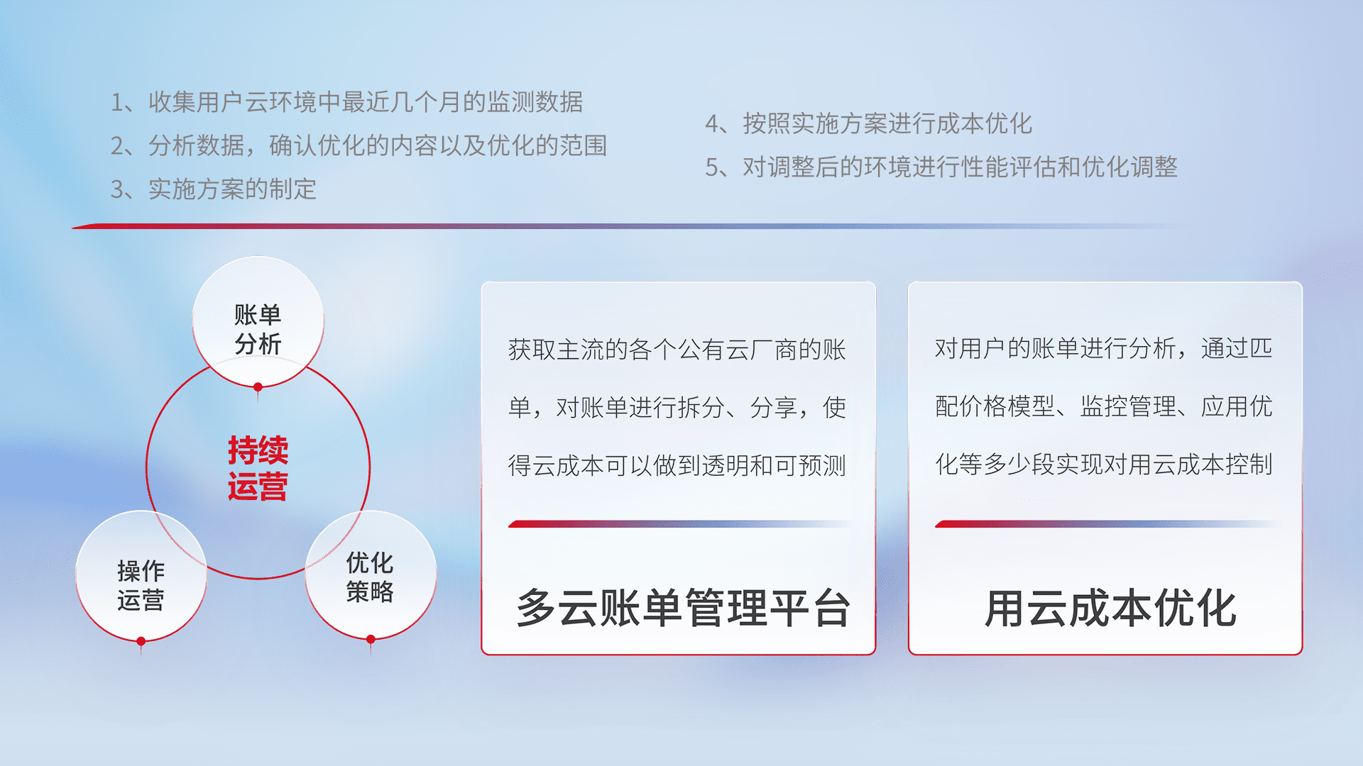 通过多云纳管,,以统一的资源数据模型把客户的云资源进行抽象和封装,,,进而实现对多云资源的统一操作,,,保障云资源管理的可靠性、、、、稳定性与可用性。。。量身定制化运维内容,,,配置、、开发运维、、补丁管理、、备份、、、、监控、、、认证和访问管理、、、、审计和日常巡检等,,,,保障在用云过程中的可靠度,,,稳定度以及高可用率。。。